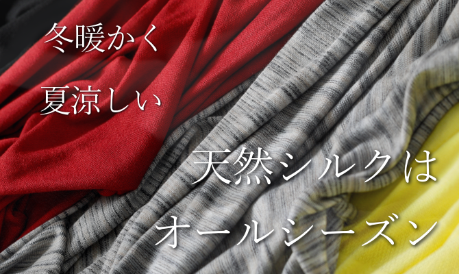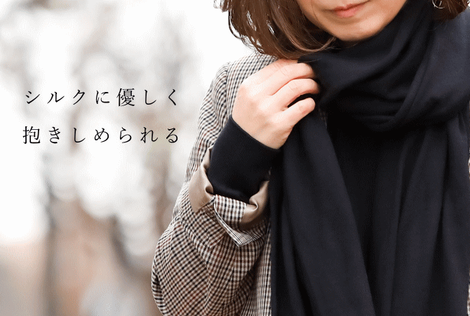 シルク独自の優しい光沢と肌触りに包まれて、季節を問わず肌身離せなくなる一枚。
