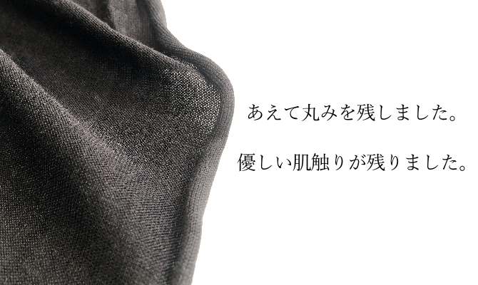 ・ニットの機械で編み込んでいる伸縮性のある製品の特性上、端の部分が丸まってます。通常であればロックミシン等で丸まりを抑えるのですが、そうするとせっかくのシルクのやわらかい風合いが損なわれるため、あえてそのまま丸みを活かしております。襟元の素肌のシットリ・フワフワなシルクの肌触りを是非堪能してください。